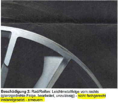 - Nicht fachgerecht instandgesetzt: Viele Leasingnehmer scheuen die hohen Kosten einer verkratzten glanzgedrehten Felge und geben die Felge zur Reparatur in eine Werkstatt, die sich mit glanzgedrehten Felgen nicht wirklich auskennt. Das Ergebnis ist eine schlecht aufbereitete Felge. Hinzu kommt, dass der Sachverständige, der die nachbearbeitete Felge begutachtet, nicht weiß, wie stark die Felge vorher beschädigt war. Da ein größerer Schaden nicht ausgeschlossen werden kann, muss der Gutachter eine neue Felge ansetzen. Der Leasingnehmer muss nun doppelt zahlen. Die nicht fachgerechte Reparatur und die neue Felge.