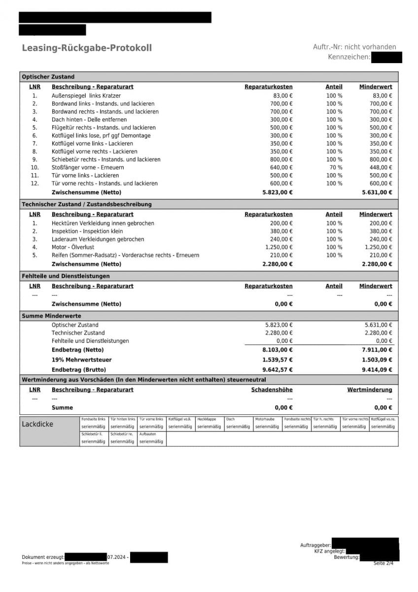 In diesem Fall finden wir in der ersten Spalte die Beschreibung des Mangels und des Bauteils. In der zweiten Spalte werden die Reparaturkosten aufgeführt, welche notwendig werden um den Mangel zu beseitigen. In der dritten Spalte finden wir den Anteil des "Minderwerts". Und zum Schluss der tatsächliche Minderwert im Verhältnis zu den Reparaturkosten. Für den Leasingnehmer ist die letzte Spalte des Minderwerts ausschlaggebend.